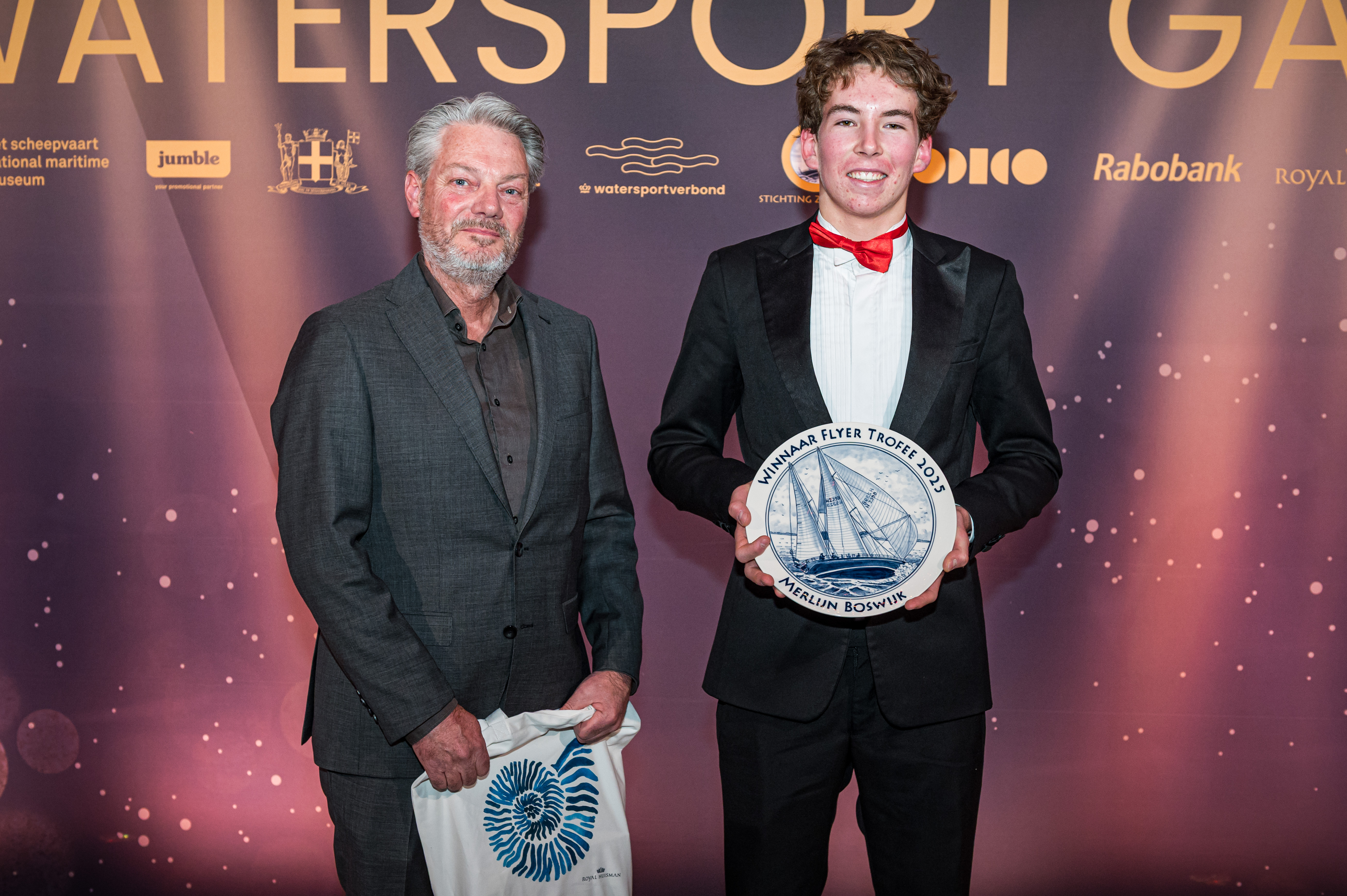 De Flyer Trofee ging naar Merlijn Boswijk voor zijn uitzonderlijk overwinningen in de iQFOiL-klasse. Hij zeilde een geweldig jaar met een eerste plaats op het WK iQFOiL onder 17 en een tweede plaats op het EK onder 17. Tussendoor heeft hij heeft ook nog de Ronde om Texel gewonnen.