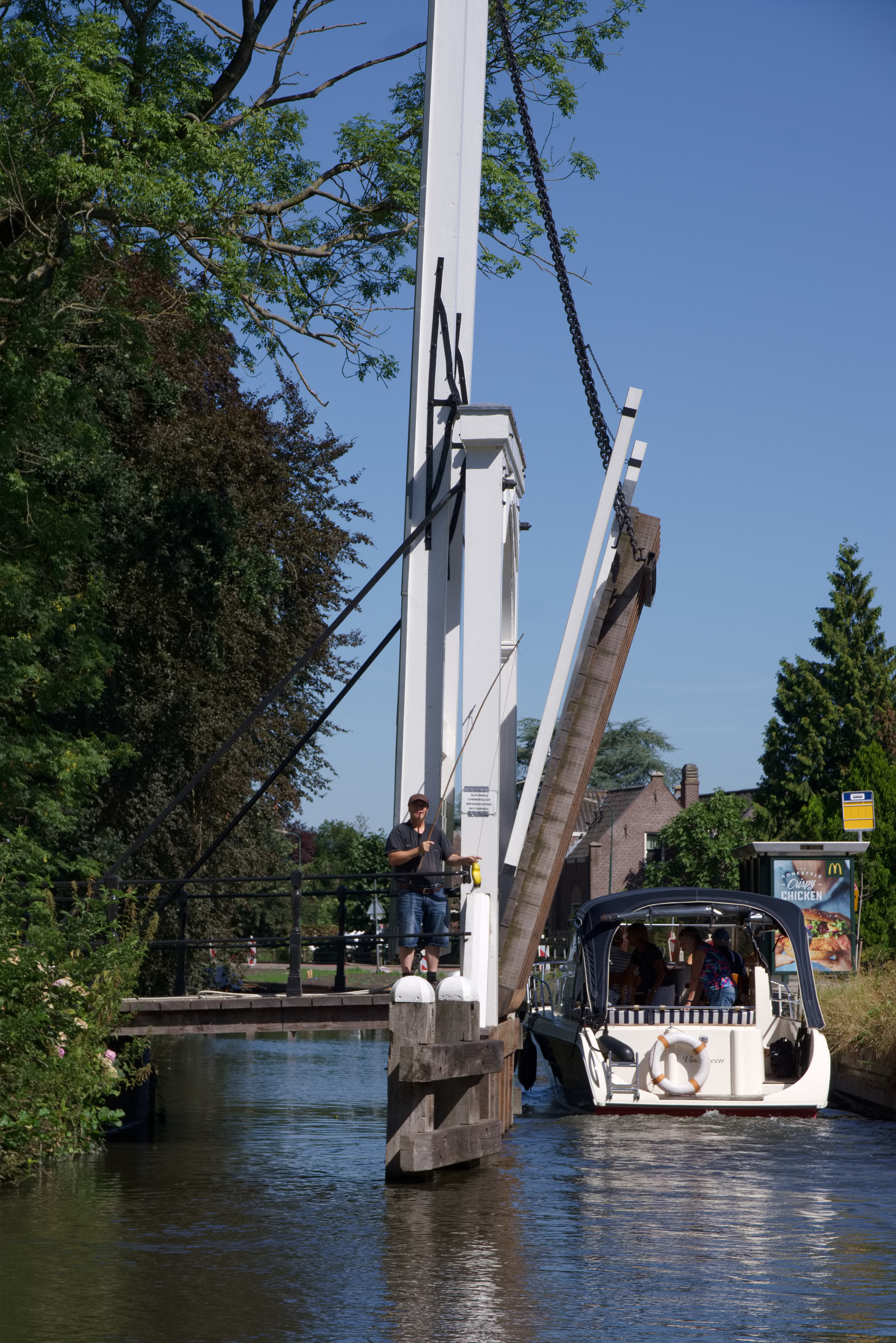 Het riviertje de Angstel weet ons vanaf de eerste aanblik te bekoren. We passeren aan stuurboord een paar fraaie woonboten en houden ons aan de maximum vaarsnelheid van 6km/u. Onder een boogbrug door varen we het plaatsje Loenersloot binnen. De eerste brug die voor ons open moet is al omhoog. We vragen de brugwachter met zijn klompje wat we daarin moeten doen. Het antwoord 'dat moet u zelf weten !' was eigenlijk niet het antwoord dat we verwachtten. De brug blijkt de slotbrug te heten en voor ons ontvouwt zich de reden daarvan. De brug geeft toegang tot het slot Loenersloot, het enig overgebleven kasteel in de nabije regio. Het oudste deel ervan dateert uit de 13e eeuw. Het kasteel ziet er dankzij een restauratie prima uit. Het is in beheer bij de Stichting Utrechts Landschap die het slot op haar website het 'best bewaarde geheim van de Randstad' noemt. In het seizoen kun je er op vrijdag en zaterdag met een rondleiding mee.