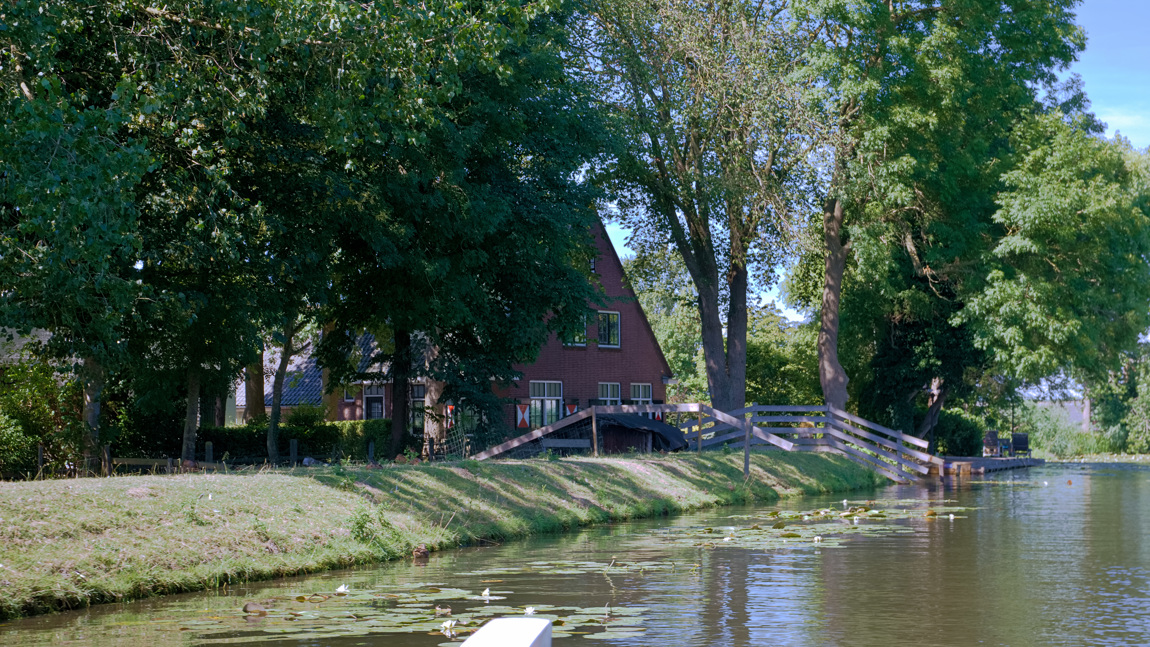 We varen door langs het dorp Loenersloot en genieten van het gekronkel van de vaarweg. Het uitzicht is daardoor afwisselend en toch doorlopend fraai. We passeren een prieel aan stuurboord met een opvallend kleurige uitstraling. Onderweg naar Baambrugge zien we aan bakboord een prachtige hoeve. Even later hebben we weer zo'n aantrekkelijk prieel, ditmaal aan bakboord. Toch is de omgeving niet poenerig maar eerder zoiets als romantisch. We varen door Baambrugge en hebben het gevoel dat de tijd hier heeft stilgestaan. Als we het dorpje weer uit zijn gevaren is de vaarweg onverminderd fraai. Op dit gedeelte komen we een aantal bruggen tegen die van zichzelf al open staan. De laatste is een smalle ophaalbrug bij molen 't Hoog- en Groenland. De molen heeft op de molenbaard het jaartal 1760 staan. Maar volgens de website hebben de molenaars een motief om aan te nemen dat de molen nog 80 jaar ouder is. We laten dit voor wat het is en varen door het dorp Abcoude naar het gelijknamige meer. We hadden het al op de kaart gezien, maar stellen nu ook in de praktijk vast dat het Abcoudermeer wel een wat weidse benaming is voor deze kleine plas. Maar oud is de plas wel. Er is wat discussie of ze dateert van voor onze jaartelling of uit de 11e eeuw. Het meer duikt in ieder geval rond 1300 op in een lijst met kerkelijke bezittingen, maar dat levert geen bijdrage aan de discussie. De tegenstelling oud en nieuw wordt extra benadrukt doordat midden in ons beeld een hypermoderne windmolen staat. Het meer wordt voornamelijk recreatief gebruikt en ziet er aantrekkelijk uit.