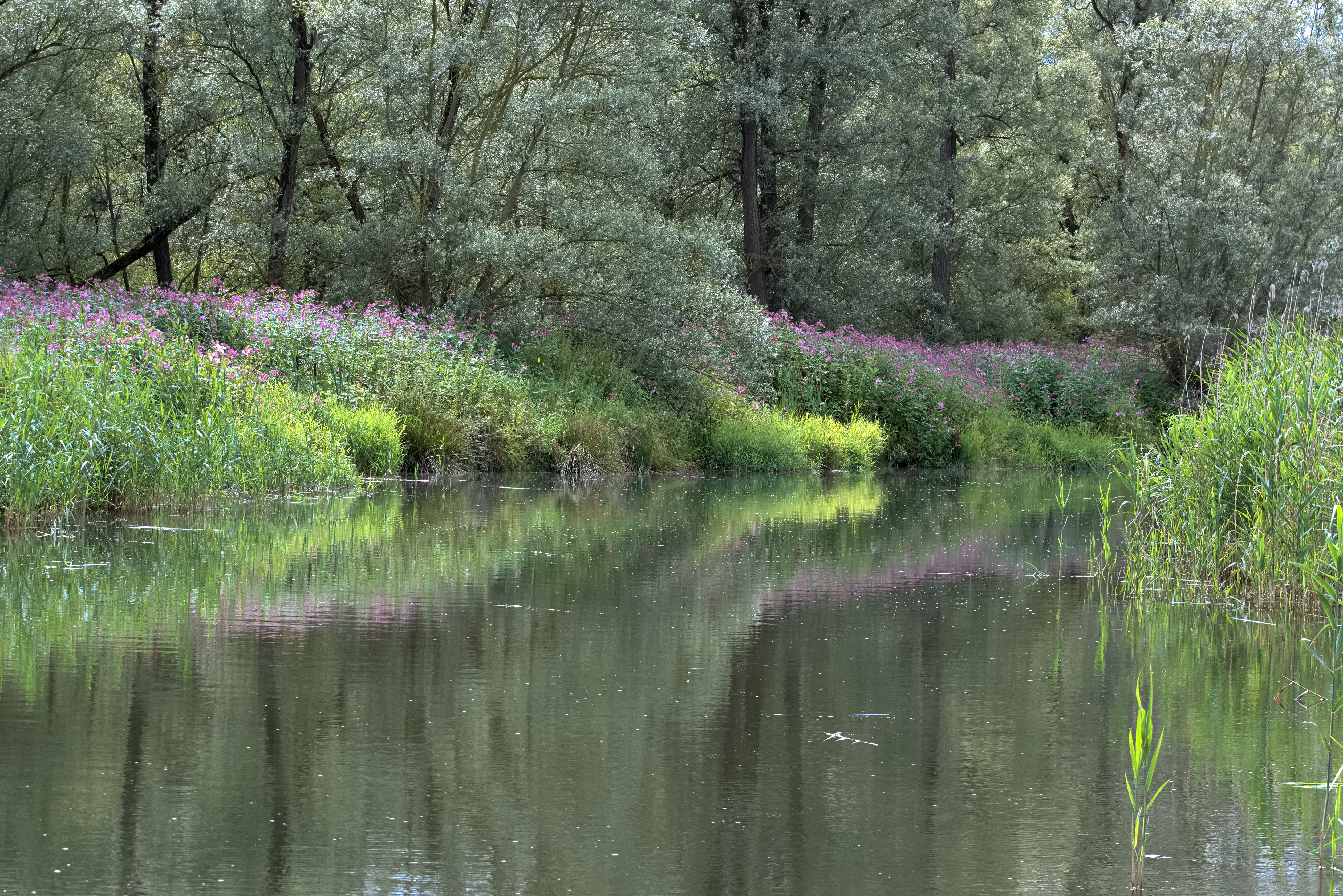 We gaan stuurboord uit de Ruigt op en letten goed op de diepte, omdat er een paar ondiepten op de kaart staan aangegeven. Kort daarna gaan we bakboord uit onze eerste kreek in, het Buiten Kooigat. Binnen de kortste keren wordt de vaarweg spannend smal. De aangegeven diepte is 0m70 en we hopen maar dat dit water er ook echt staat. Inge vraagt op de kreken de dieselmotor uit te zetten en de elektromotor te gebruiken. Met alleen het geluid van kabbelend water varen we genietend langs de indrukwekkende hagen van roze balsemien en gele walstro.