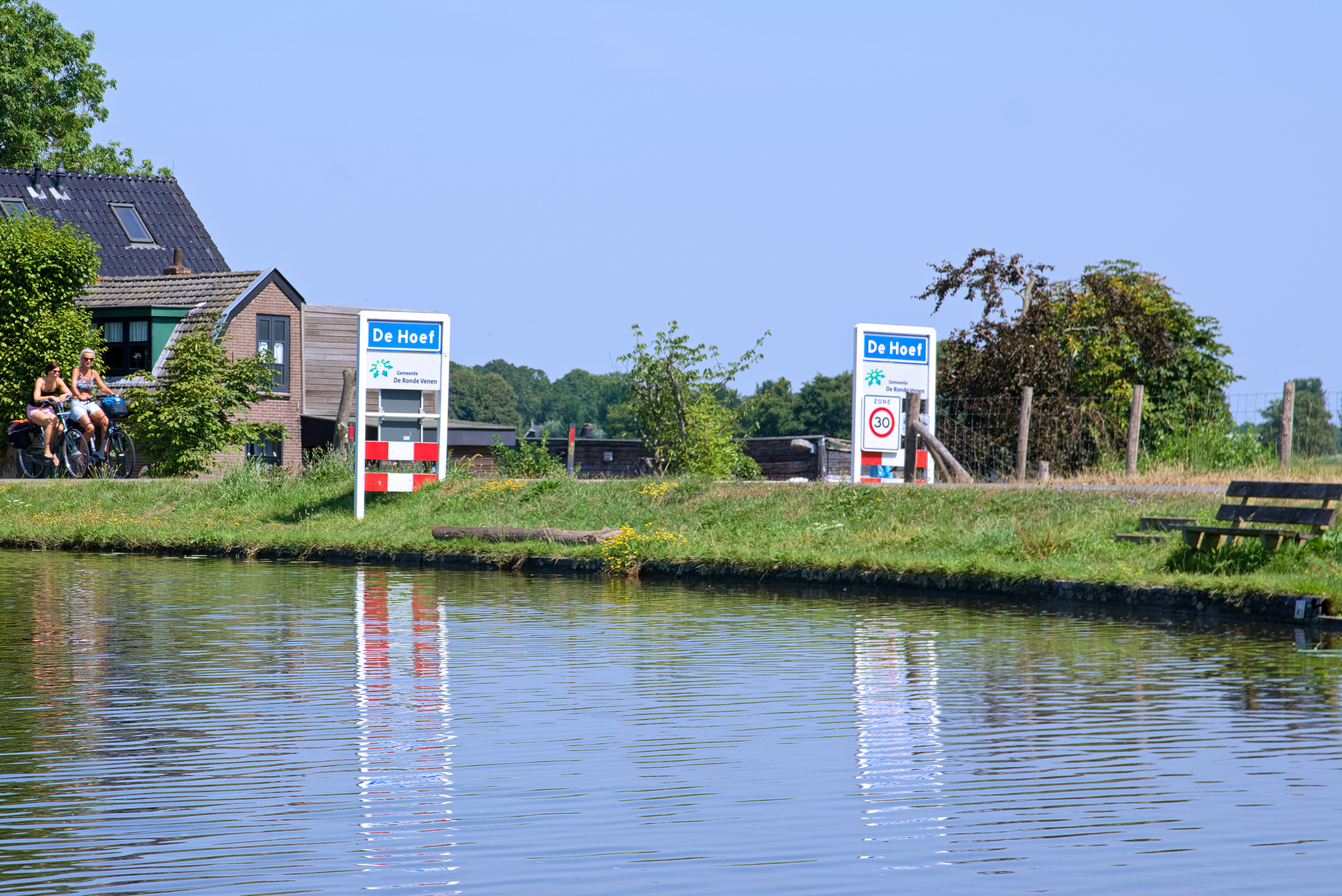 We kiezen voor de rest van de route de Kromme Mijdrecht en de Kerkvaart. Vooral de eerste doet op veel plaatsen qua natuurschoon niet onder voor de Grecht. Het is er eigenlijk een soort van look-a-like van.  De wateralmanak heeft hier ook weer een mooie typering voor: 'landschappelijk vaarwater'. Met een weg ernaast en met iets meer bebouwing is het inderdaad minder 'eenzaam' dan de Grecht. Maar het blijft wel een prachtige vaarweg. We bereiken na verloop van tijd het bungalowpark Zomerlust. Daar is een opvallende dubbele fietsbrug aangelegd, waar we in het midden gemakkelijk onderdoor varen. Na nog een prachtig stuk vaarweg komen we door het plaatsje De Hoef. Het is rond lunchtijd en de aanlegsteiger bij een terras ziet er zo aantrekkelijk uit dat we de verleiding niet kunnen weerstaan.