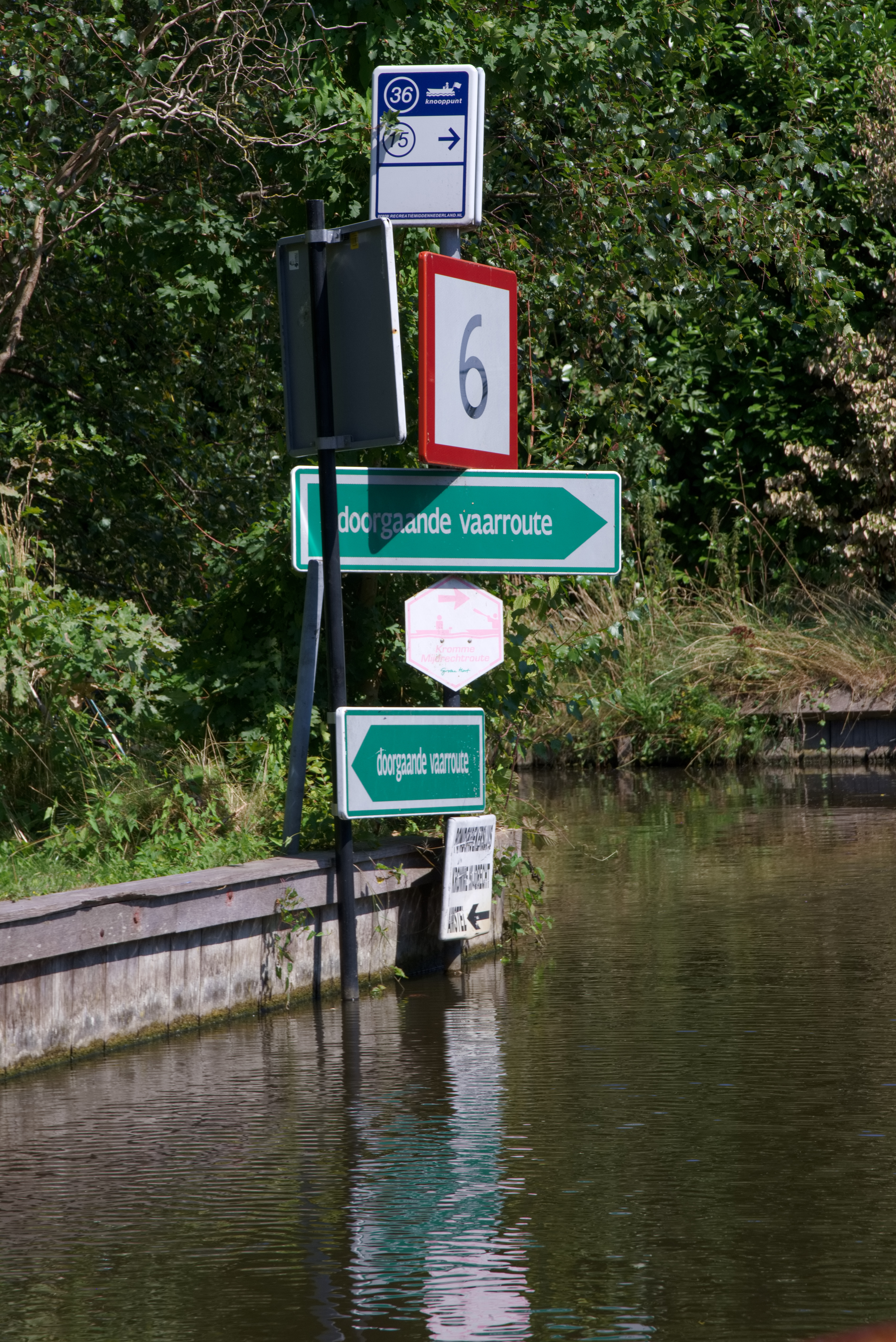 Als we enige tijd later verder varen, treffen we aan stuurboordzijde de Pondskoekersluis met een vaste brug daarvoor. De sluis schut naar de Kerkvaart en daar willen we heen. De sluiswachter is een gezellige tante : 'Ik ben een huisvrouw met een leuke baan. Ik ben in dienst van Waternet!'. Tegen het in deze regio gebruikelijke tarief laat ze ons een kleine 2m zakken. De Kerkvaart is een saaie, rechte vaart van 1km. In Mijdrecht draaien we stuurboord uit de Ringvaart van Groot Mijdrecht op. Blijkbaar varen hier wel eens mensen mis want er zijn heel erg duidelijke borden geplaatst waar de doorgaande vaarroute ligt. Mijdrechts eerste bewoners waren er al in de 11e eeuw. Er heeft in de Middeleeuwen een kasteel gestaan maar daar is later overheen gebouwd. En wel zo dat we de exacte locatie van het kasteel niet meer weten.