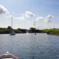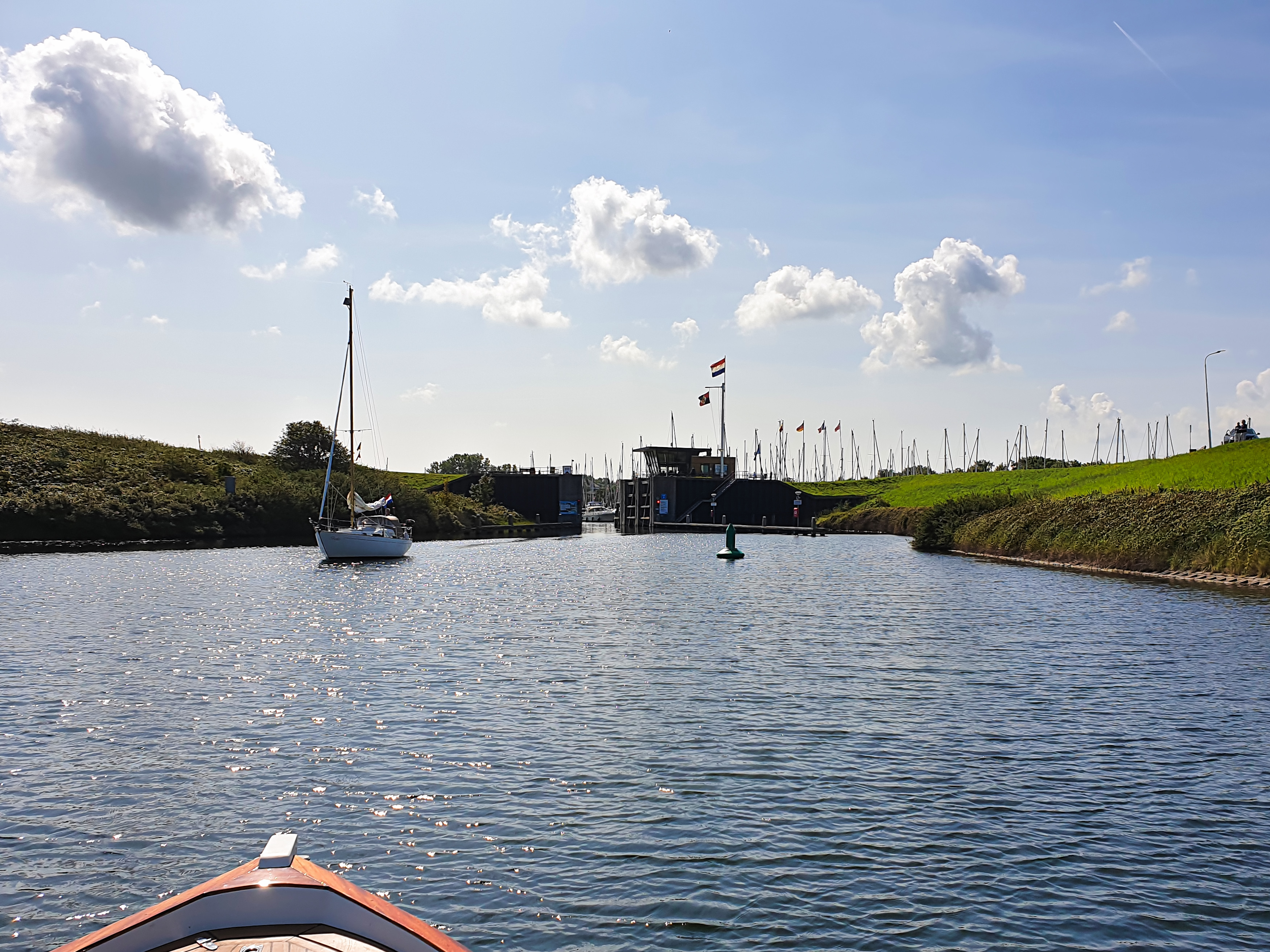 Om op de Grevelingen te komen moet je je vanaf het Krammer (de Oosterschelde) laten schutten door de Grevelingensluis. De sluis heeft imposante afmetingen: 140m lang en 16m breed. Op de sluismuren staan stewards de schippers te bewegen hun boot verder vooraan in de sluis te manoeuvreren. In de sluis blijkt – met een beetje indikken – een onvoorstelbare hoeveelheid boten te passen. Als we uit de sluis varen zien we een grote watervlakte. In dat opzicht is er in elk geval weinig verschil met het Haringvliet.
