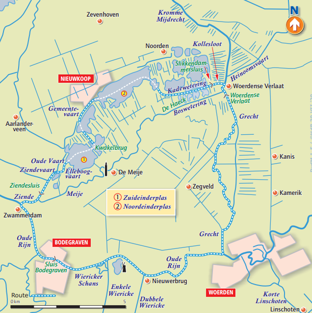 We steken de Zuideinderplas schuin over in de richting van de Kwakelbrug. Dit is een zelfbedieningsbrug, voor het geval je kruiphoogte boven 2m80 ligt. Dan moet je wel – tegen betaling - de code hebben gekregen om het combinatieslot te openen. De Kwakelbrug ligt in het Oortjespad dat Nieuwkoop verbindt met het buurtschap De Meije. Het fiets- en wandelpad dankt zijn naam aan de tol (een oortje) die  vroeger voor een passage werd geheven. Na de brug gaan we bakboord uit de Gemeentevaart op. Deze vaart verbindt de Zuideinder- met de Noordeinderplas en is een kleine 3 km lang. Aan het eind van de luxe bebouwing langs de Gemeentevaart bereiken we de Noordeinderplas. Dit is een wat langgerekte plas die loopt van Nieuwkoop naar het plaatsje Noorden. Op de plas komen zo af en toe wat veenbonken omhoog. Die zijn dus niet altijd gemarkeerd en dat maakt het varen hier wat spannender. We steken de plas in de lengte over en zorgen ervoor uit de buurt te blijven van de veenbonken. Als we de plas af varen naar de Kadewetering hebben we aan bakboordzijde de legakkers van Noorden.