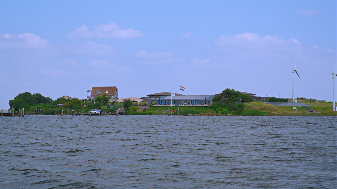 Als we ons rondje om Pampus maken, stellen we vast dat je het beter van bovenaf kunt bekijken. Officieel heet het eiland Fort aan het Pampus. Het is een kunstmatig forteiland dat is aangelegd in de jaren 1887-1895. Het is gebouwd om de Stelling van Amsterdam te completeren. Boeiend is dat het fort nooit voor gevechtshandelingen is gebruikt. Het is flink in verval geraakt door andersoortig gebruik. De Duitsers oefenden er in de oorlog mee voor precisiebombardementen. Ze sloopten de kanonnen en het staal voor de eigen oorlogsindustrie. Na de oorlog werd het gebruikt om munitie tot ontploffing te brengen. Sinds 1990 is het overgedragen aan de Stichting Forteiland Pampus. Er is heel veel puin geruimd, het fort is gerestaureerd en je kunt het tegenwoordig bezoeken. Het fort heeft anno nu een museale functie en er is een lunchrestaurant.