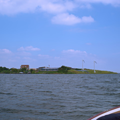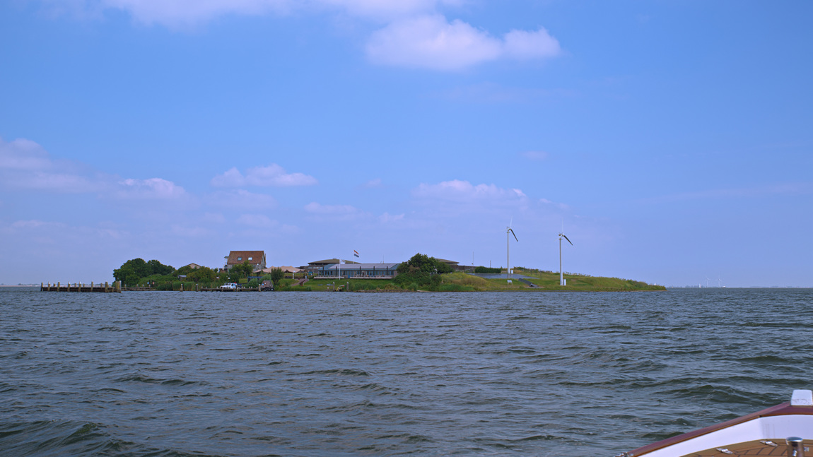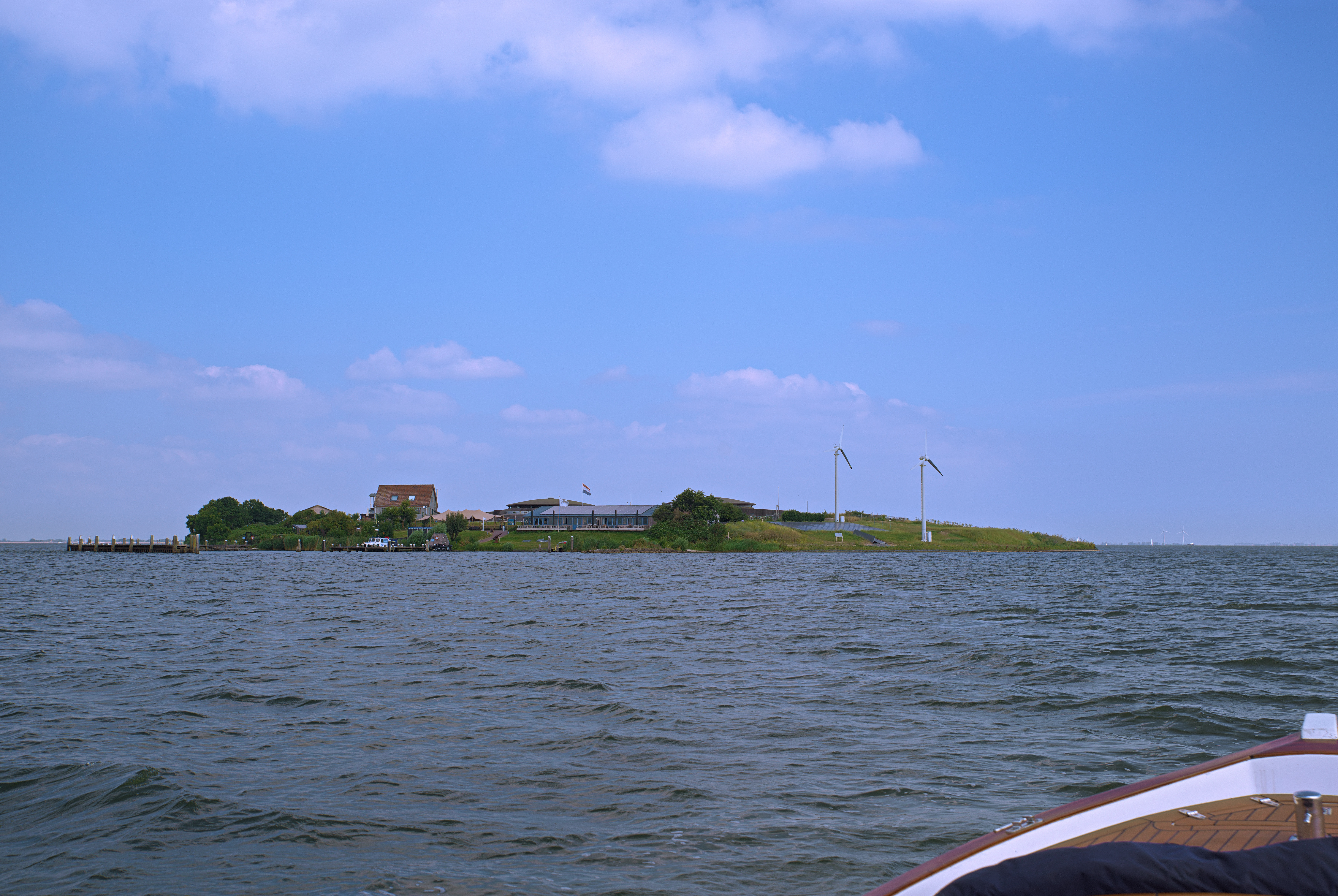 We vervolgen onze vaartocht in de vaargeul die ons uit de haven van Muiden leidt. Even later komen we op het IJmeer. Hoewel het nog een flink stuk verder is, kunnen we recht voor ons in de verte het eiland Pampus zien liggen. We varen daar rustig op aan. Aan stuurboord liggen dan de 3 eilandjes De Drost, Warenar en Hooft. We varen door en realiseren ons dat we toch wel op een serieuze watervlakte zitten. Het weer is een beetje dreigend en dat versterkt dat gevoel nog wat verder.
