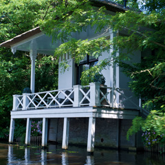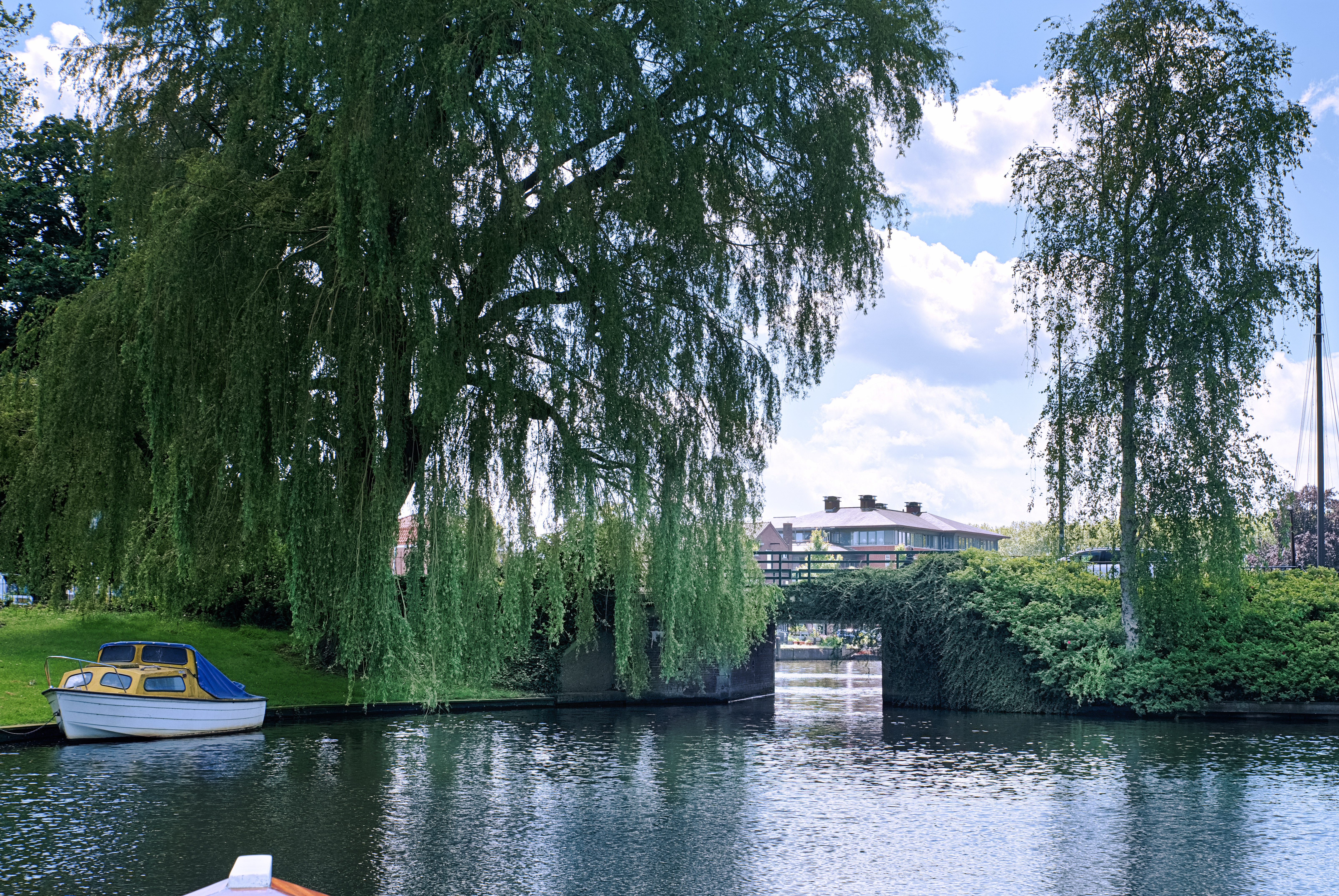 Woerden heeft singels (zo heten watergangen rond een binnenstad die een overblijfsel zijn van vroegere verdedigingsgrachten). Zo’n singel heeft vrijwel nooit gemetselde kademuren maar nagenoeg altijd schuin aflopende walkanten. En dat is in Woerden niet anders. Komend vanaf Leiden kun je bij binnenkomst in de stad bakboord uit. Je moet dan wel onder de vaste brug van 2m door. Op deze Zandwijksingel - verderop de Burgemeester H.G. van Kempensingel - valt op hoe rijk aan groen het centrum van Woerden is gebleven. De gelukkigen die hier mogen wonen hebben aan het water priëlen gebouwd die aan de Vecht doen denken. Ondanks de parkachtige omgeving kom je nauwelijks andere watersporters tegen. Onderweg is nog een uitstapje mogelijk dat alleen met een doorvaarthoogte van max 1m10 mogelijk is. Deze singel voert zo mogelijk nog meer door het centrum van de stad. Je vaart hier onder meer langs de Lutherse kerk uit 1646. Die wordt getypeerd als een zogenoemde schuilkerk terwijl ze toch als kerkgebouw zeer herkenbaar is. Dit water loopt uiteindelijk dood op een lage vaste brug.