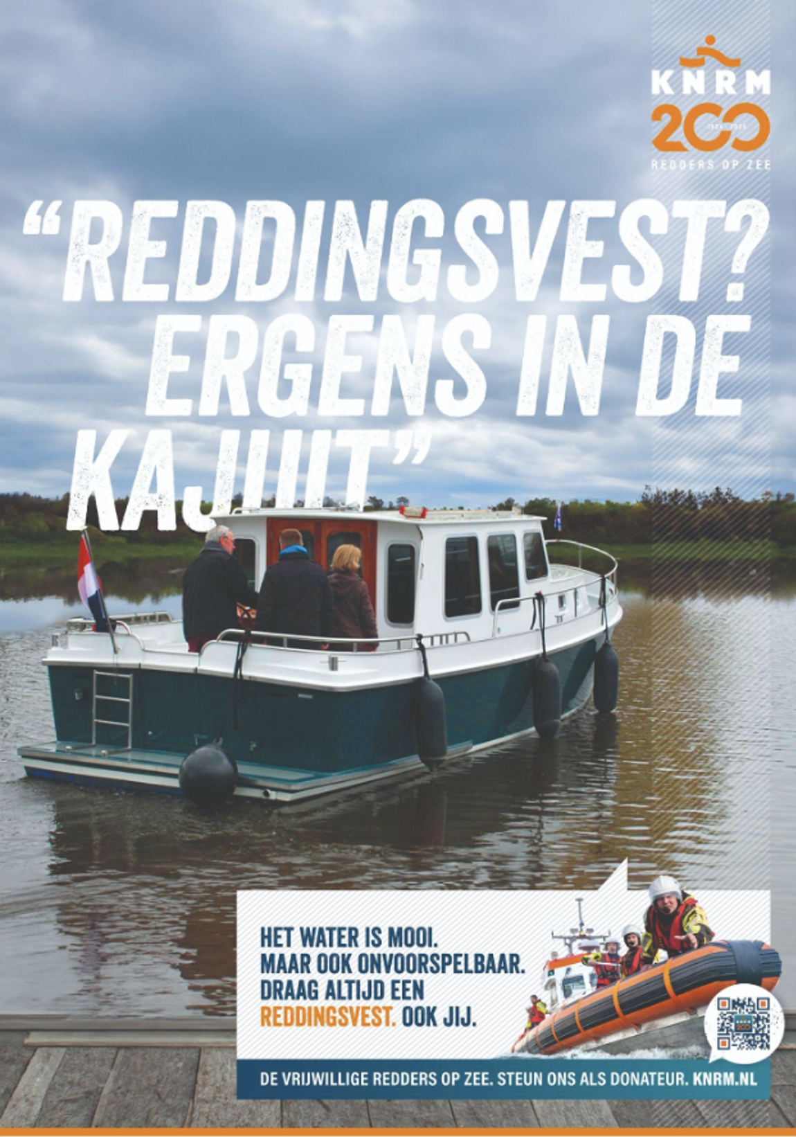 Slechts 30% van de Nederlandse watersporters draagt consequent een reddingsvest. Dat kan én moet veel beter. De campagne begint dan ook met extra aandacht voor het reddingsvest. Een reddingsvest vergroot je overlevingskans aanzienlijk. Als er iets gebeurt, heb je vaak niet de kans om alsnog het vest aan te trekken. Bijvoorbeeld als je na een tik van de giek overboord valt of verkrampt door het koude water. Draag daarom op het water altijd een reddingsvest. Want wie drijft, die blijft.