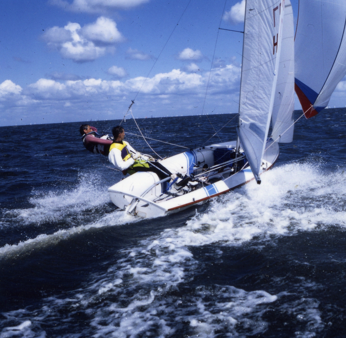 “Ik ben als tiener begonnen. Mijn vader kocht een klein kajuitbootje en dat was het moment dat ik ook maar moest leren zeilen. Dat ben ik destijds gaan doen in een Vrijheid, op de Kralingse Plas, bij de zeilschool van Henk van Gent.” Toen hij eenmaal de eerste kneepjes kende, werd de jonge Arend in de haven aangesproken. “Martin van Olffen vroeg me of ik met hem in een Pluis wilde varen. Dat hebben we toen twee jaar samen gedaan. Bloedfanatiek. Maar wat zeilen nu echt was, daar had ik toen nog niet echt een idee van. Ik wist alleen maar dat je hard moest hangen en hard aan dingen moest trekken.”