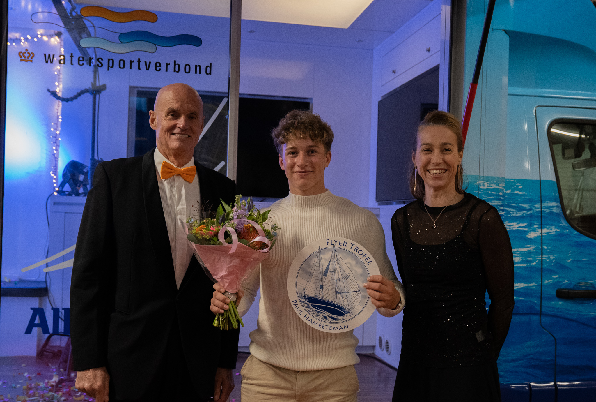 - Foto 1: Paul Hameeteman (midden), winnaar Flyer Trofee 2021 met presentatoren Jur Raatjes (links) en Marcelien Bos-de Koning (rechts)