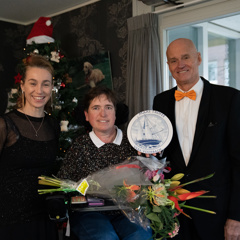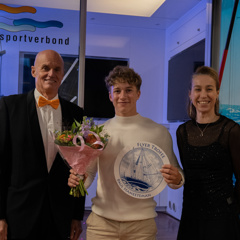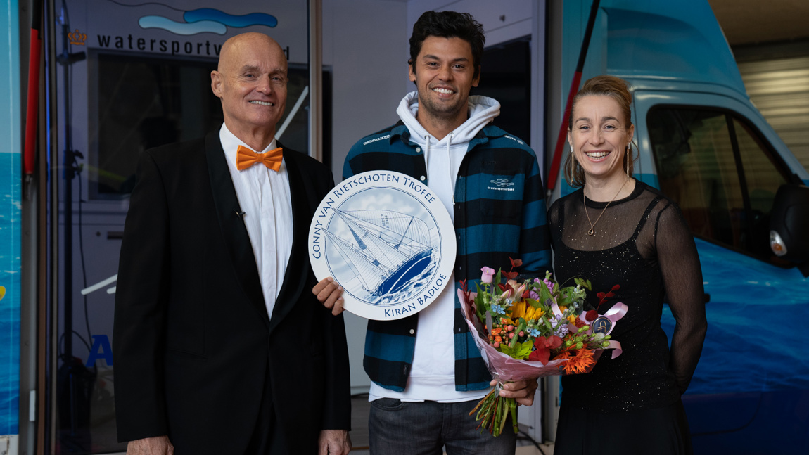 - Foto 1: Kiran Badloe (midden), winnaar Conny van Rietschoten Trofee 2021 met presentatoren Jur Raatjes (links) en Marcelien Bos-de Koning (rechts)