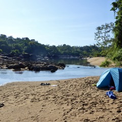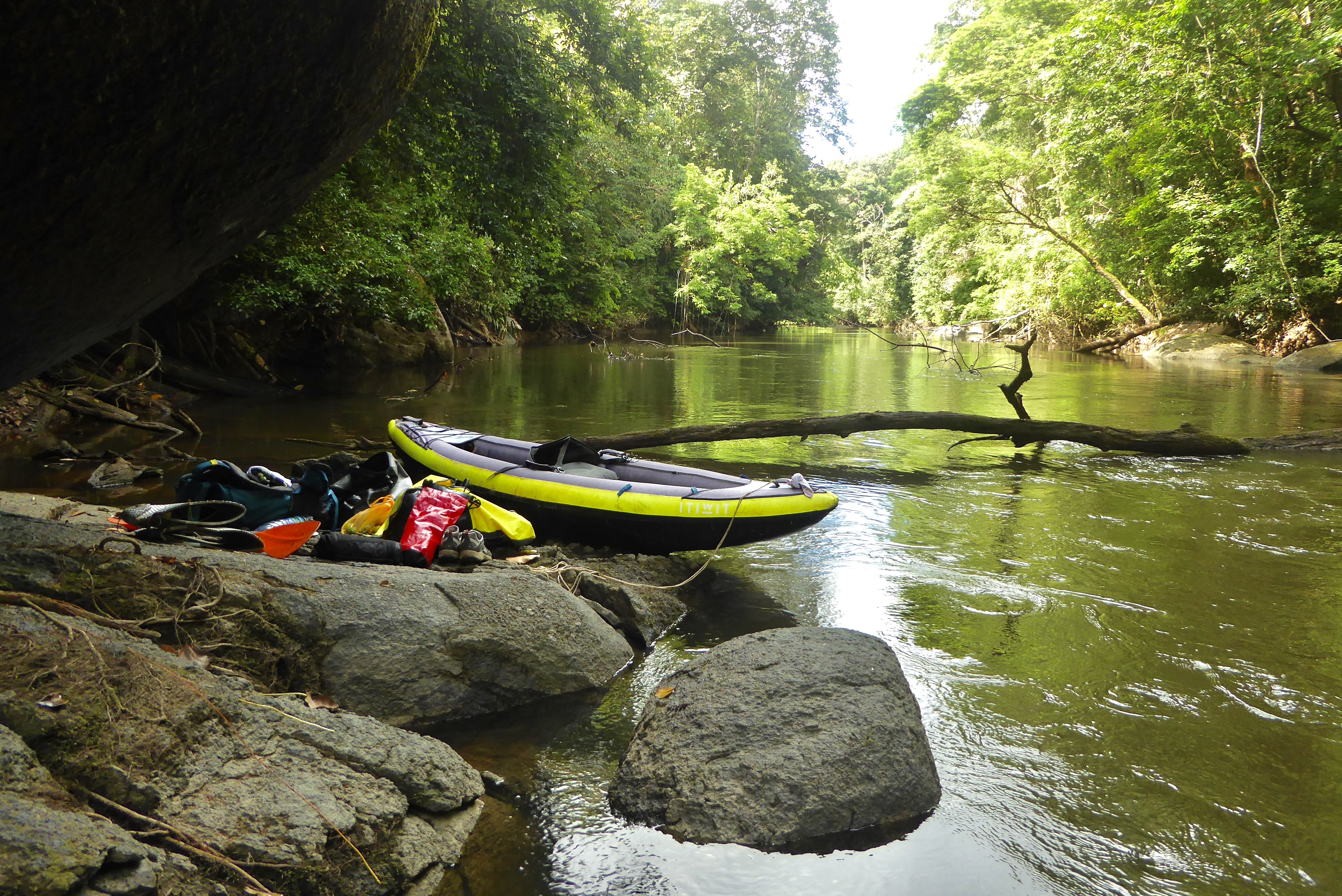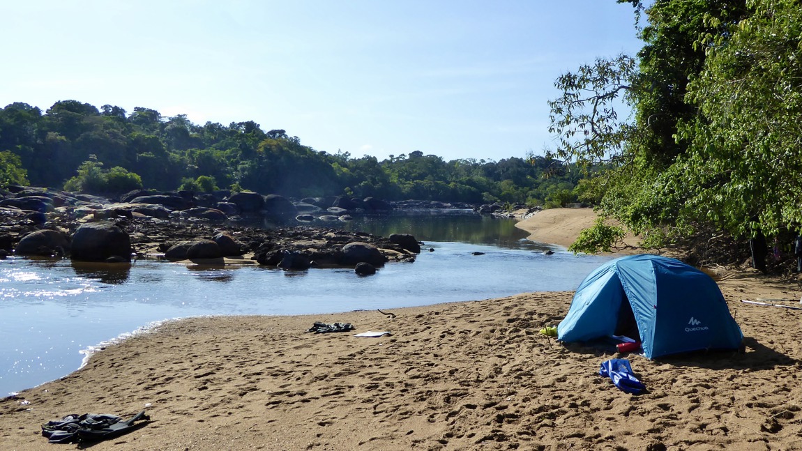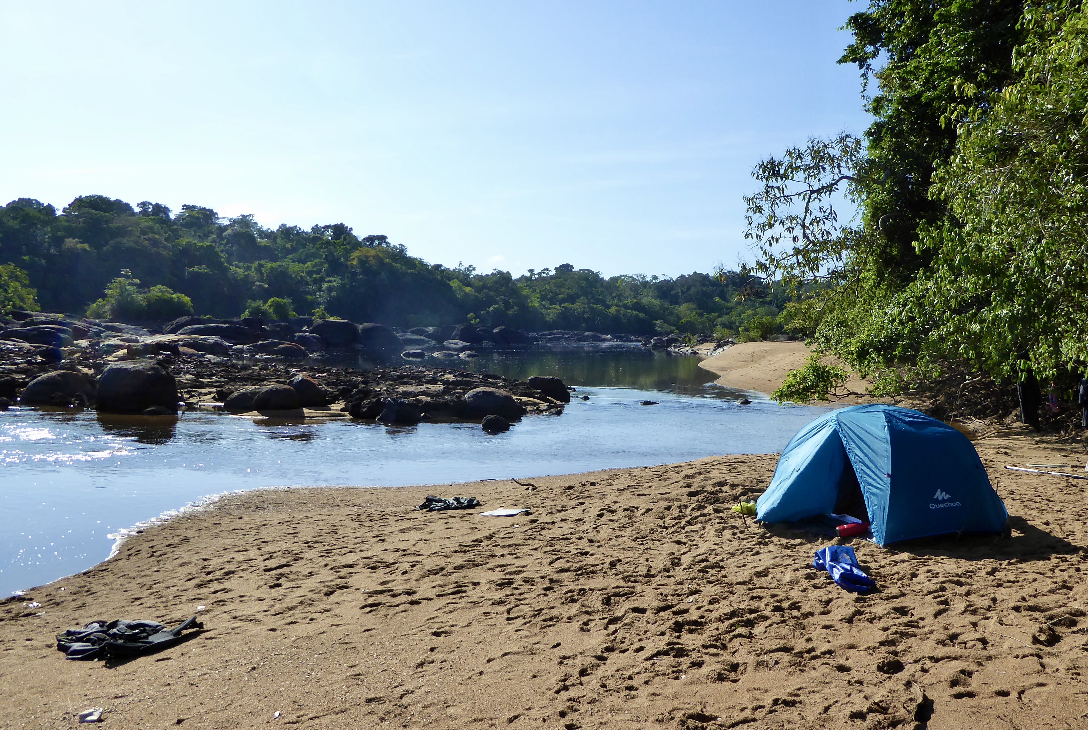 Jerry, de bootsman van Kosindo lodge in Cajana, brengt me nog weer 60 km verder het binnenland in. Hij zet me af bij Sintiadam, een grote stroomversnelling. Als ik hem zie terugvaren, mij achterlatend op een zandbank, alleen, midden in de jungle, overvalt me toch even de vraag of deze tocht een goed idee is. Erg veel tijd om te piekeren is er niet, want ik moet de tent opzetten, boot opblazen, eten maken, water filteren; kortom zorgen dat voor de schemering alles klaar is want het is heel snel heel donker. De volgende dag begint mijn eigen kanotocht, nog een kleine 80 km naar de plek waar het graf zou moeten zijn. De rivier is hier nog ongeveer 50 meter breed en goed stroomopwaarts te bevaren.
