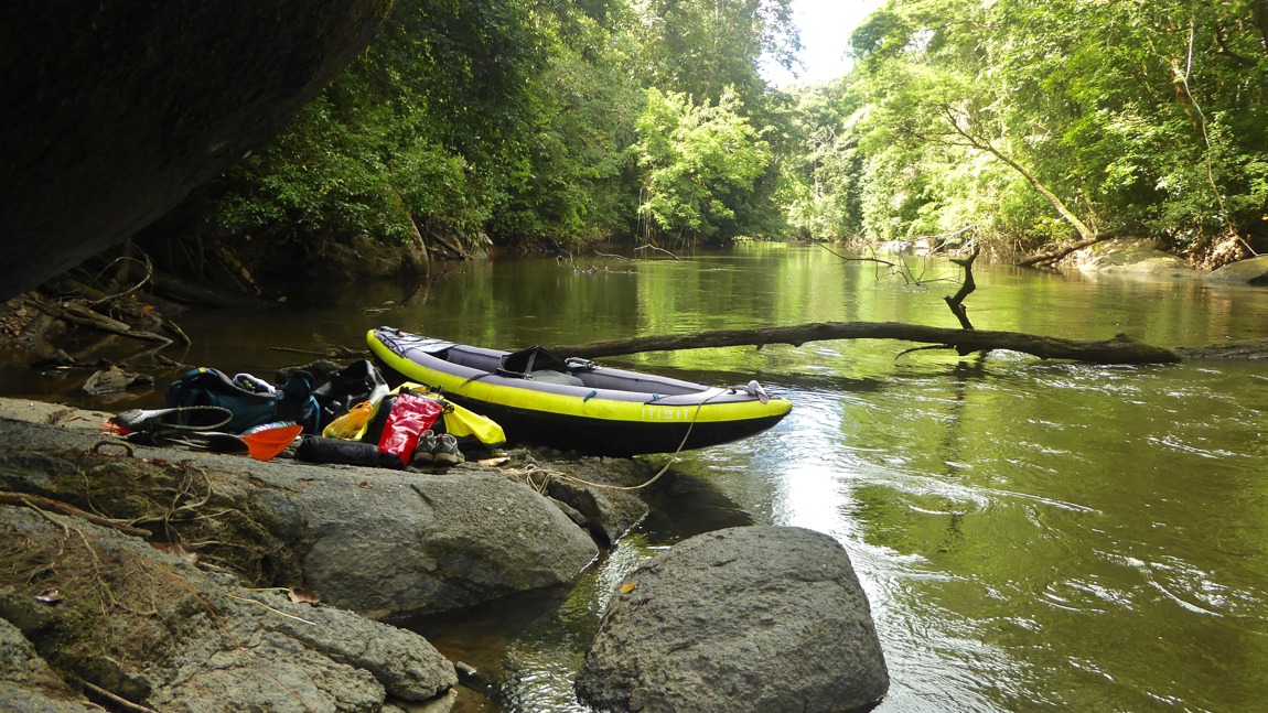 De eerste twee dagen zijn er weinig serieuze stroomversnellingen en peddel ik lekker door. Dan volgt een traject met 6 grote ‘vallen’ kort achter elkaar. De expedities van 1910, 1926 en 2000 hadden er meerdere dagen voor nodig. De verslagen van die expedities zijn voor mij niet alleen heel vermakelijk om te lezen maar ook een houvast om te weten wat me te wachten staat. Met een lichte boot en betrekkelijk weinig bagage lukt het mij in één dag. Stroomversnellingen passeren is elke keer weer anders. Soms lukt het om van steen naar steen traverserend naar boven te komen maar vaak moet ik de boot uit. Slepen door ondiepere delen, door waterplanten waden of alles uitladen en naar boven tillen. Daarna is het tijd om te pauzeren met koffie of een lunch en het zweet van me afspoelen.