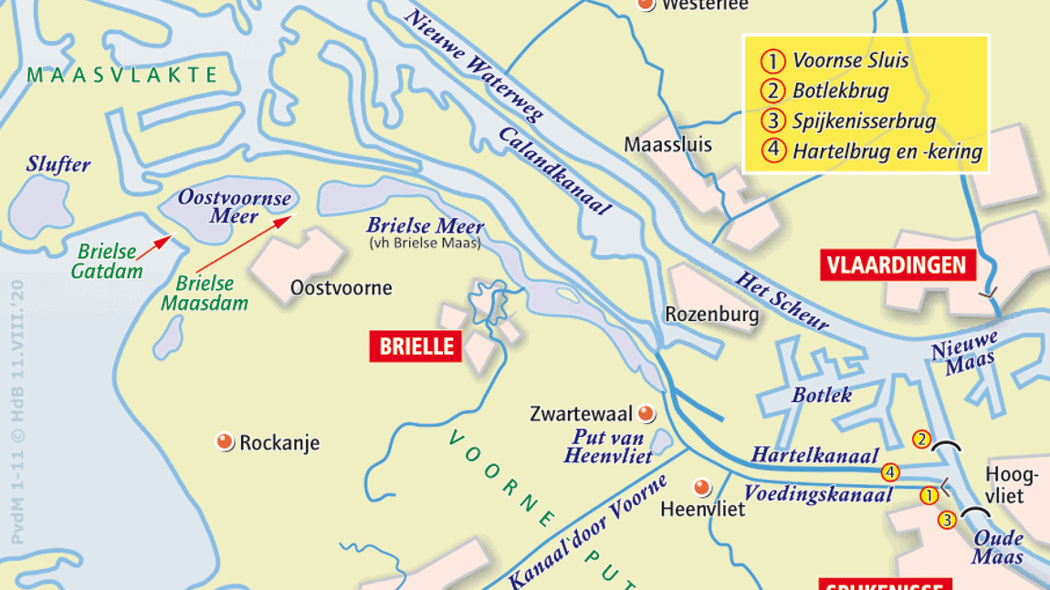 De verbinding tussen de Oude Maas en het Brielse Meer loopt via het voedingskanaal. Voeding slaat op de aanvoer van zoet water. De primaire functie van het Brielse Meer is het fungeren als zoetwaterbuffer om de verzilting van Voorne-Putten tegen te gaan. Het voedingskanaal is zo’n 8 kilometer lang en loopt van Spijkenisse naar Zwartewaal. Dat het Brielse Meer zelf – als voormalige rivier - een langgerekt meer is zal weinig verbazing wekken. Het is zo’n 10 kilometer lang en heeft als bekende plaatsen Brielle en Oostvoorne. Na de afdamming heeft het zich snel ontwikkeld tot een in de regio belangrijk watersport- en recreatiegebied. Er is een keur aan jachthavens en 3x24 aanlegplaatsen, kampeergelegenheden, stranden en ligweiden. Door de bebossing van de oevers kun je genieten van fraai natuurschoon, meestal zonder last te hebben van horizonvervuiling. Er worden in het gebied af en toe bevers gesignaleerd. En dat met de petrotanks van Vopak op minder dan 2 kilometer !