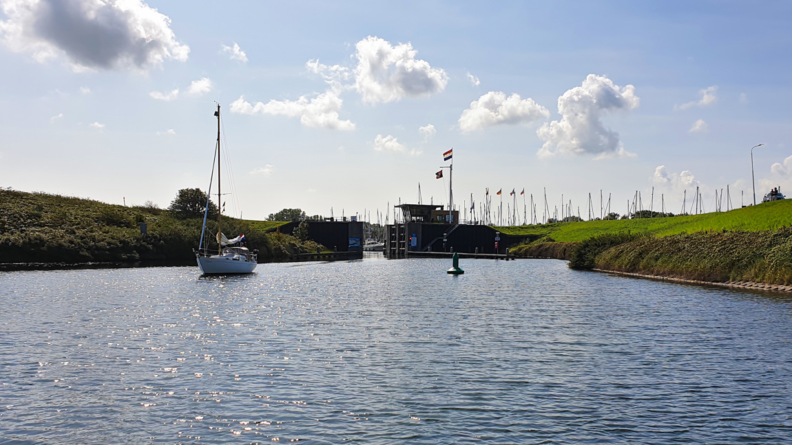 Om op de Grevelingen te komen moet je je vanaf het Krammer (de Oosterschelde) laten schutten door de Grevelingensluis. De sluis heeft imposante afmetingen: 140m lang en 16m breed. Op de sluismuren staan stewards de schippers te bewegen hun boot verder vooraan in de sluis te manoeuvreren. In de sluis blijkt – met een beetje indikken – een onvoorstelbare hoeveelheid boten te passen. Als we uit de sluis varen zien we een grote watervlakte. In dat opzicht is er in elk geval weinig verschil met het Haringvliet.