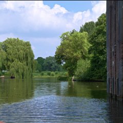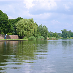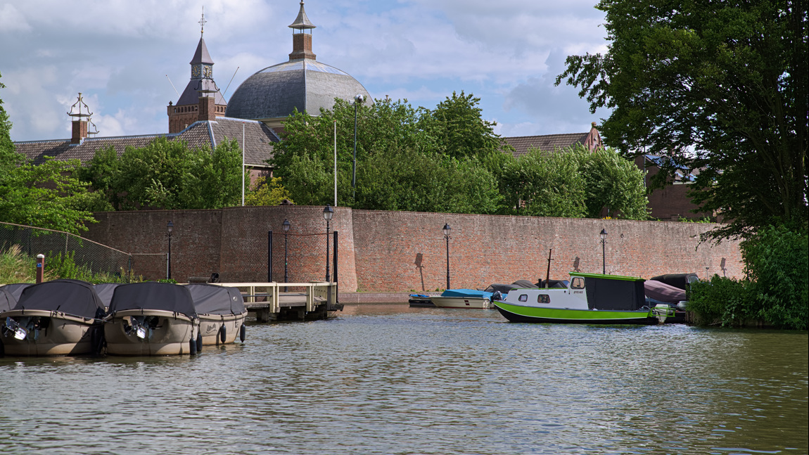 We varen door en vinden de vaarweg tussen Heukelum en Leerdam onverminderd landelijk. Net als we ons af beginnen te vragen hoe ze hier het nieuwe geld van de oevers hebben weten te weren, komen we een prachtig optrekje tegen. We verlekkeren ons er even aan en krijgen sportieve neigingen van de bijbehorende, eigen tennisbanen. Daarna komen we door de glasindustrie -waaraan Leerdam al eeuwen zijn bekendheid dankt - en passeren een overslagstation voor zand en grind. Al snel opent zich het zicht op de overgebleven en gerestaureerde stadsmuren van de Zuidwal. Het Kasteel van Leerdam is door de Spanjaarden verwoest in 1574. Op de plaats daarvan is in de 18e eeuw het Hofje van Mevrouw Van Aerden gebouwd. Het dak daarvan torent uit boven de stadsmuur en hetzelfde geldt voor de 13e-eeuwse toren van de grote kerk daarachter.